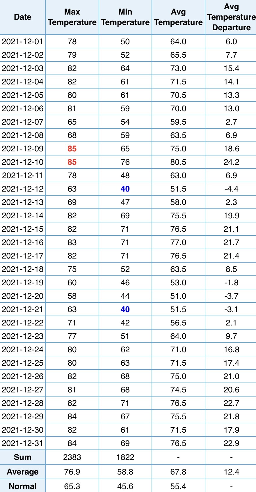 | Sunday 12/21 | 82° (2010) | 78-82° |