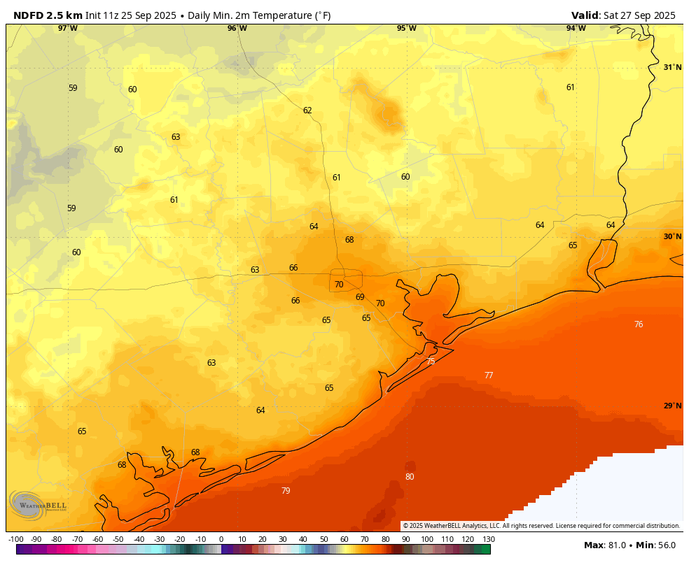 Our forecast for the weekend is one of high confidence. We will see three sunny days with high temperatures generally in the upper 80s, with nights falling into the upper 60s for most of Houston, with cooler conditions further inland and warmer ones closer to the coast. With dewpoints in the 50s and 60s the air will feel fairly dry, and mornings and evenings should feel especially fine. It’s not exactly fall like, but after a long hot summer, it’s going to feel great.