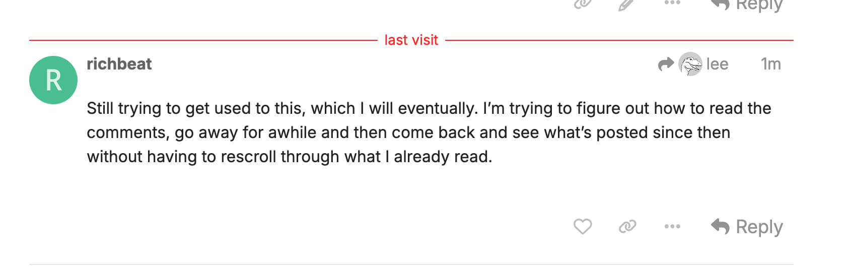 Yep, it can be a little weird, but Discourse tries to help you out. If you come back to a comment thread after being away, it should put you right back where you left off, and you should see a red “last visit” line demarcating your last-read point. Like this: