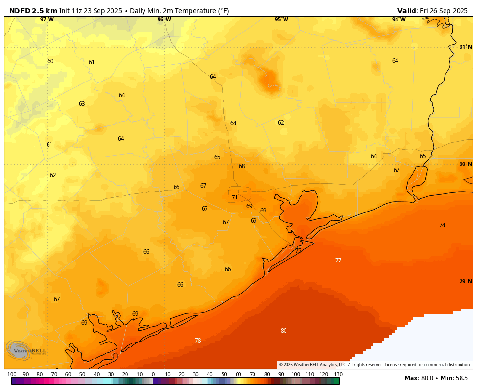 Our modestly drier air should hold on through the weekend. With sunny skies expect daytime temperatures of about 90 degrees. Lows will fall into the 60s for inland areas, with central Houston and the coast probably dropping to around 70 degrees. It won’t be fall-like, but nights and mornings should be pleasant enough.
