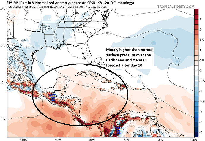 Beyond that, who is next? Great question. We are seeing noise from the GFS model beginning to stir up the Central American Gyre (CAG) late in the period. That’s a climatological quirk of the model, where it tends to gravitate toward development in that region, whether realistic or not. In this case, there’s not a whole lot we can truly say. If you go by the Euro ensemble (like below), you see that surface pressure is currently forecast to be higher than normal, typically not a signal for development.