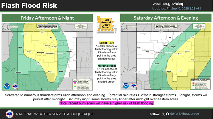 In the West, the risk is on burn scars in particular, with scattered showers and storms likely today and tomorrow across southern Colorado and New Mexico, where flood watches are posted.