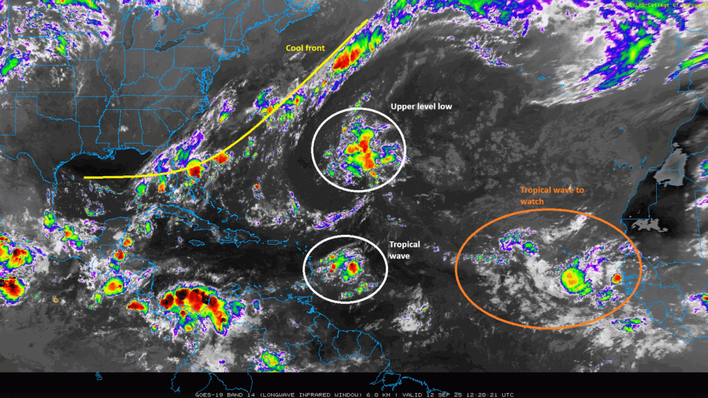 There is a cool front draped from near Florida into the Atlantic. You always watch these sorts of boundaries for any development, but there’s nothing imminent, and anything would likely track east or northeast out to sea. The big area of storms you see over the central Atlantic is an upper-level low pressure system, so that won’t develop. There’s an active tropical wave moving into the Lesser Antilles today, bringing some showers and storms but no development odds. And then there’s a broad tropical wave in the eastern Atlantic off Africa that’s now up to 40 percent odds of development as it moves into the open Atlantic this weekend and next week.