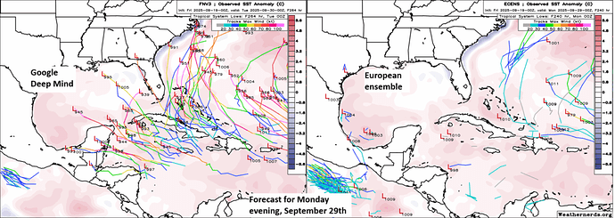 The AI model suite is very, very excited about potential development in the northwest Caribbean to close September. I show Google Deep Mind above, but if you look at other AI modeling, including the European AIFS ensemble, you get a similar pulse of enthusiasm. Traditional, physics-based models are not as enamored with this setup and keep any developments confined to a couple rogue ensemble members.