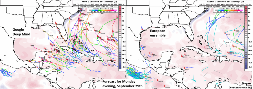 I will say, if AI modeling has had a bit of a mixed bag of results this summer, it has come with “genesis” forecasts like this; where you can’t quite determine the specific disturbance that will develop but the models are very excited. They have had some moments, but they have also had a rather high genesis false alarm rate. Climatology changes in late September and October, and this is a favored area to watch, so from that point of view, you have to at least consider it may be seeing something. Or perhaps it’s a little too overzealous based on history, which is the bread and butter of AI modeling and wants to get things started with a bang. For now, this is not really an area to worry about or even monitor closely. But it’s an area we’ll be watching, and we’ll be very curious to see how the AI tools handle this as verification rolls forward.