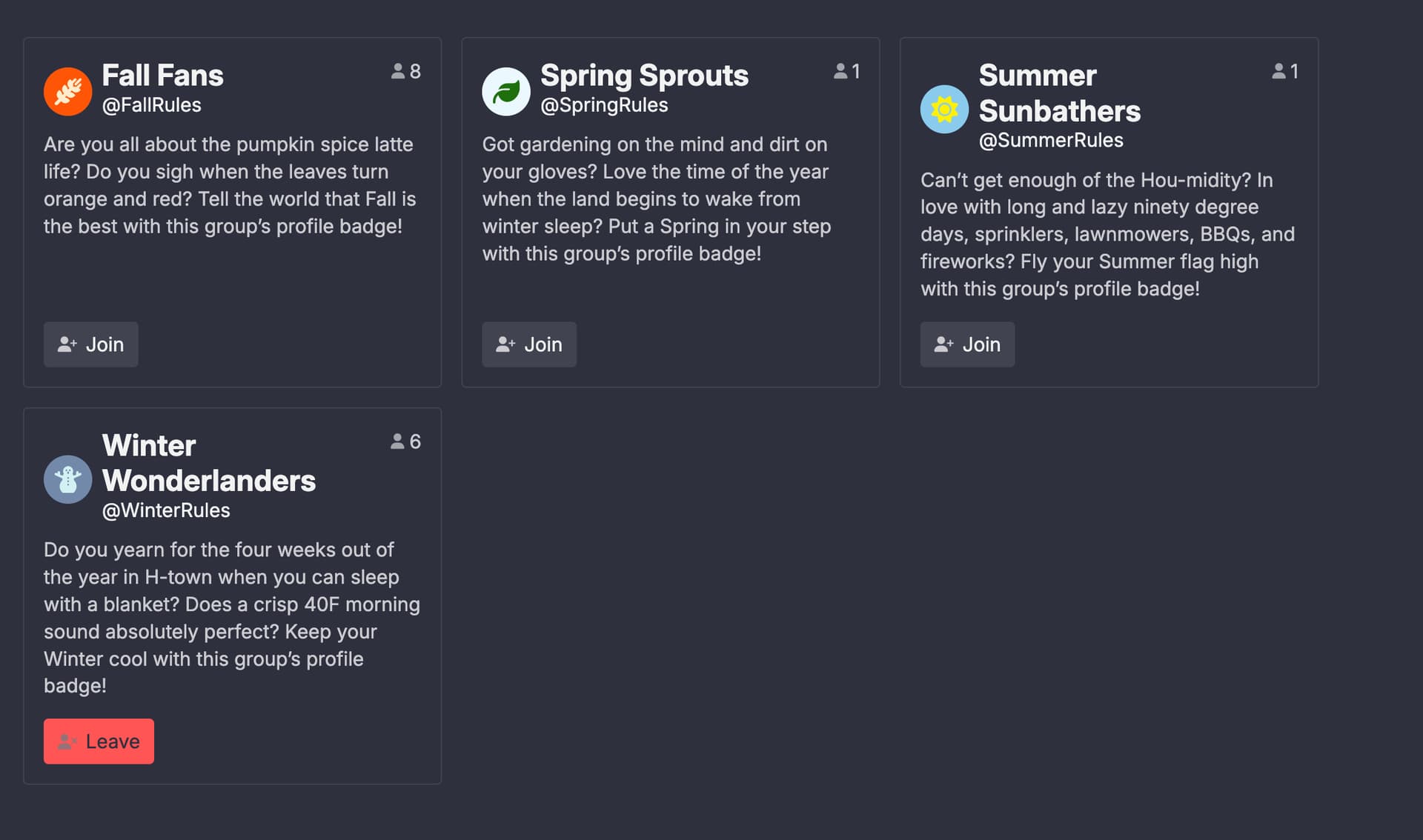 Since everyone around here has strong—often insanely strong!—opinions about Houston’s seasons, we’ve created special “seasonal” groups. Join the one (or ones!) that represent what you think is the best weather Houston has to offer, and show off that preference with little badge thingy on your avatar!
