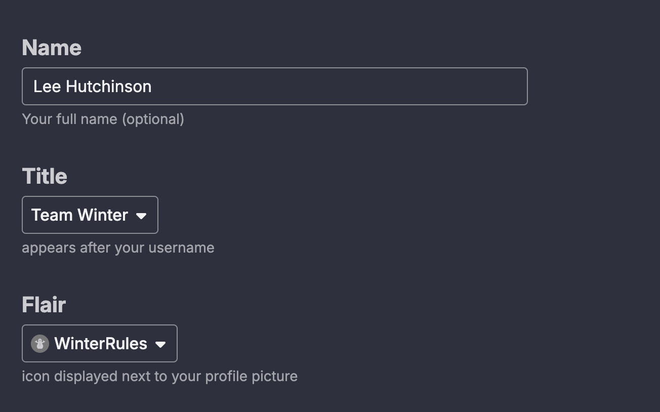 Once you join a group, you’ll gain an optional custom title repping your chosen season, along with a small seasonal badge for your profile picture. To customize this stuff, navigate to your account preferences page, and scroll down to the “Title” and “Flair” boxes.