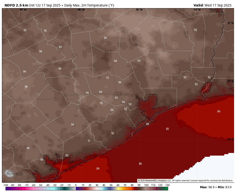 Today will bring sunny skies into the region with our typical temperatures in the low 90s for much of the central metro area, with inland areas getting a little warmer than this and the coast remaining a little cooler. There is some support in high resolution models for the development of scattered showers, and perhaps a few isolated thunderstorms, between about 3 pm and 7 pm this afternoon and early evening, before the loss of daytime heating. Lows tonight will drop into the mid-70s for most locations.
