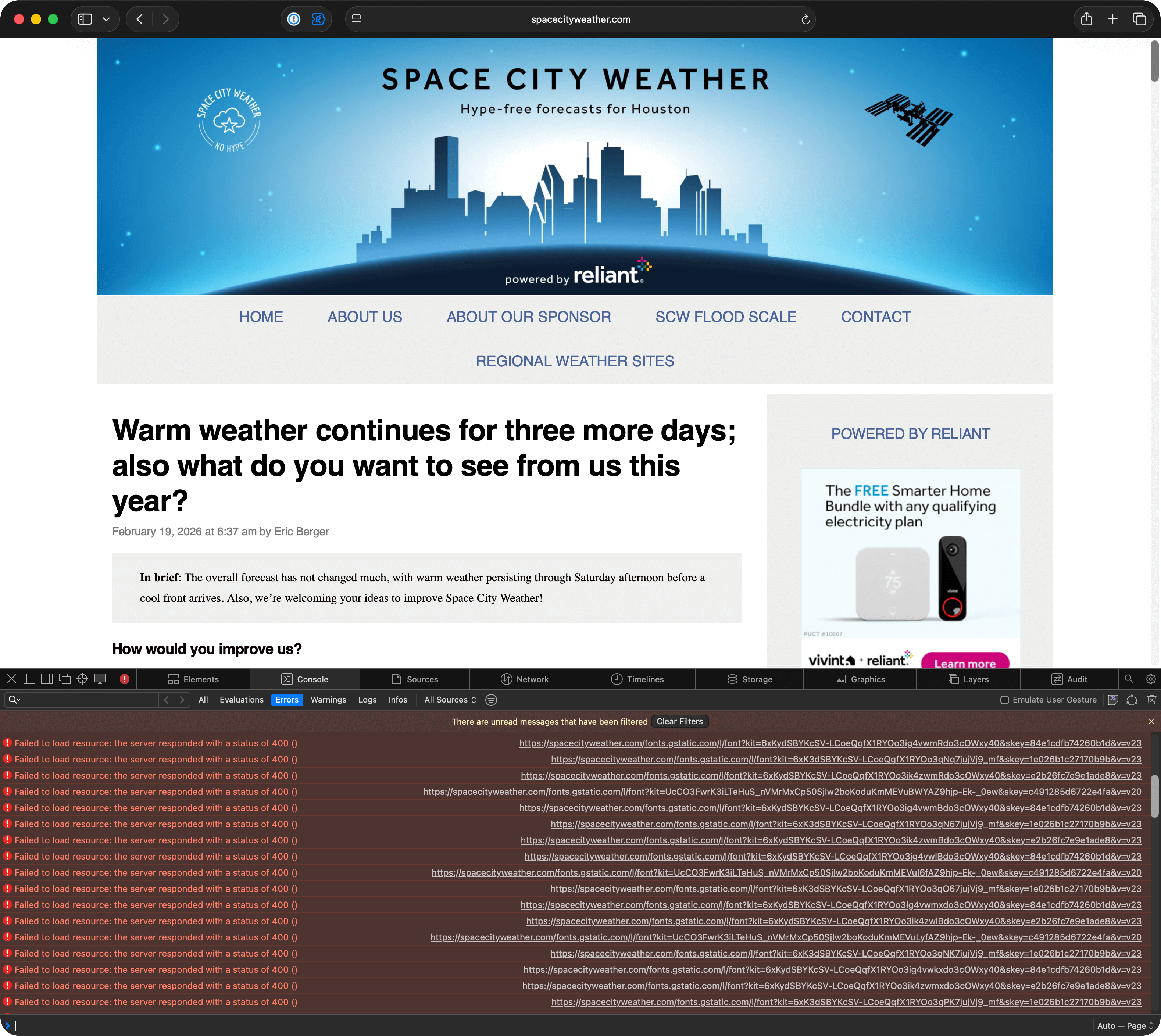 Instead of the google-provided fonts loading, they’re all failing and the browser is substituting in the default system fonts in their places. When I peek at the safari console, it looks like the browser requests for the fonts are all failing with an HTTP error code 400 (“invalid request”).