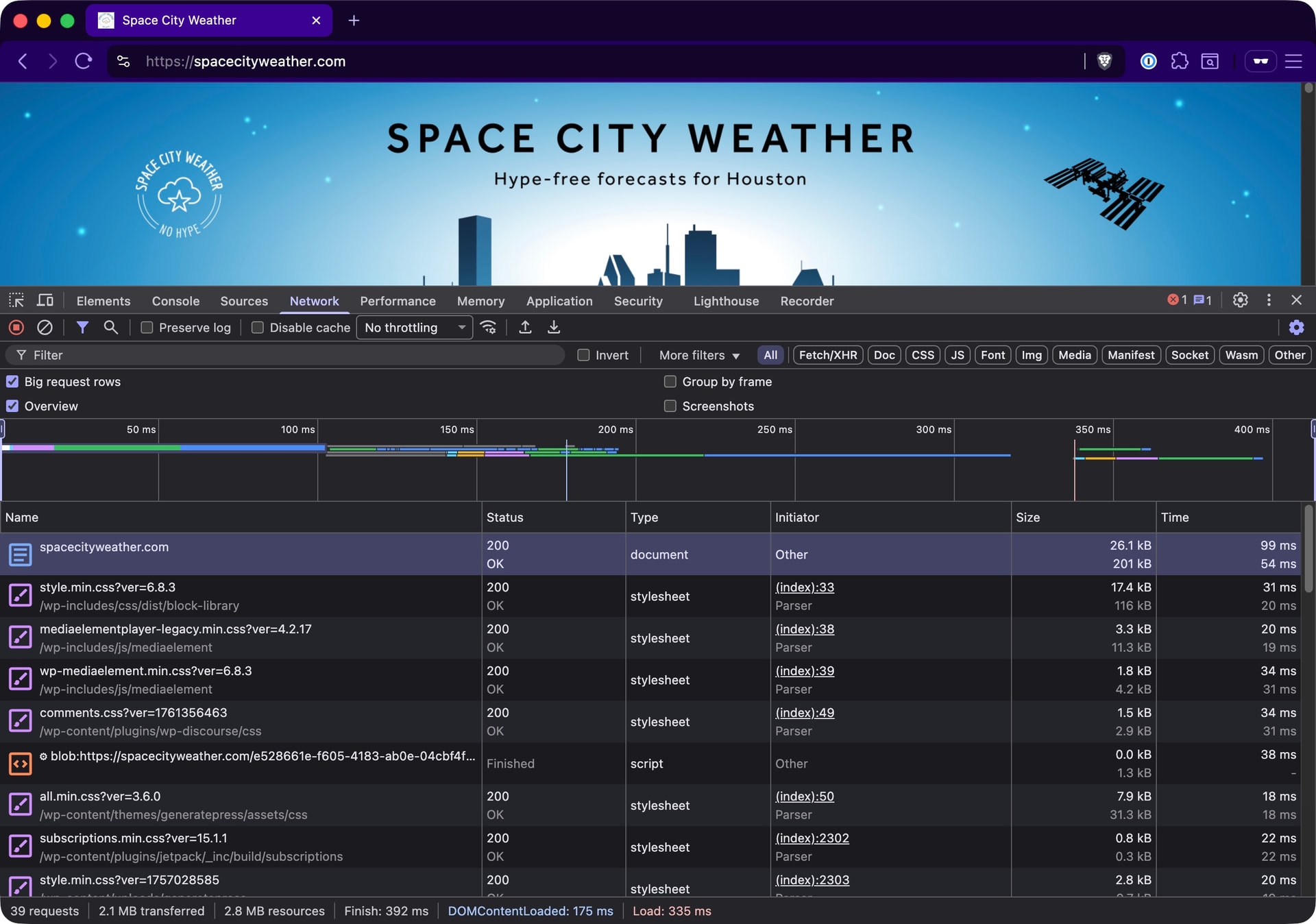 If you hit the SCW or Eyewall homepages and see a stale version of the homepage missing the latest post, open up your browser’s developer console and look a little deeper. (It’s the F12 key for Chrome, Brave, and Firefox; for Safari, go option-cmd-I.) Select the “network” tab and reload the homepage. You’ll see a list of all the different network calls your browser had to make to display the page. Scroll to the very top and look for the initial page load request: