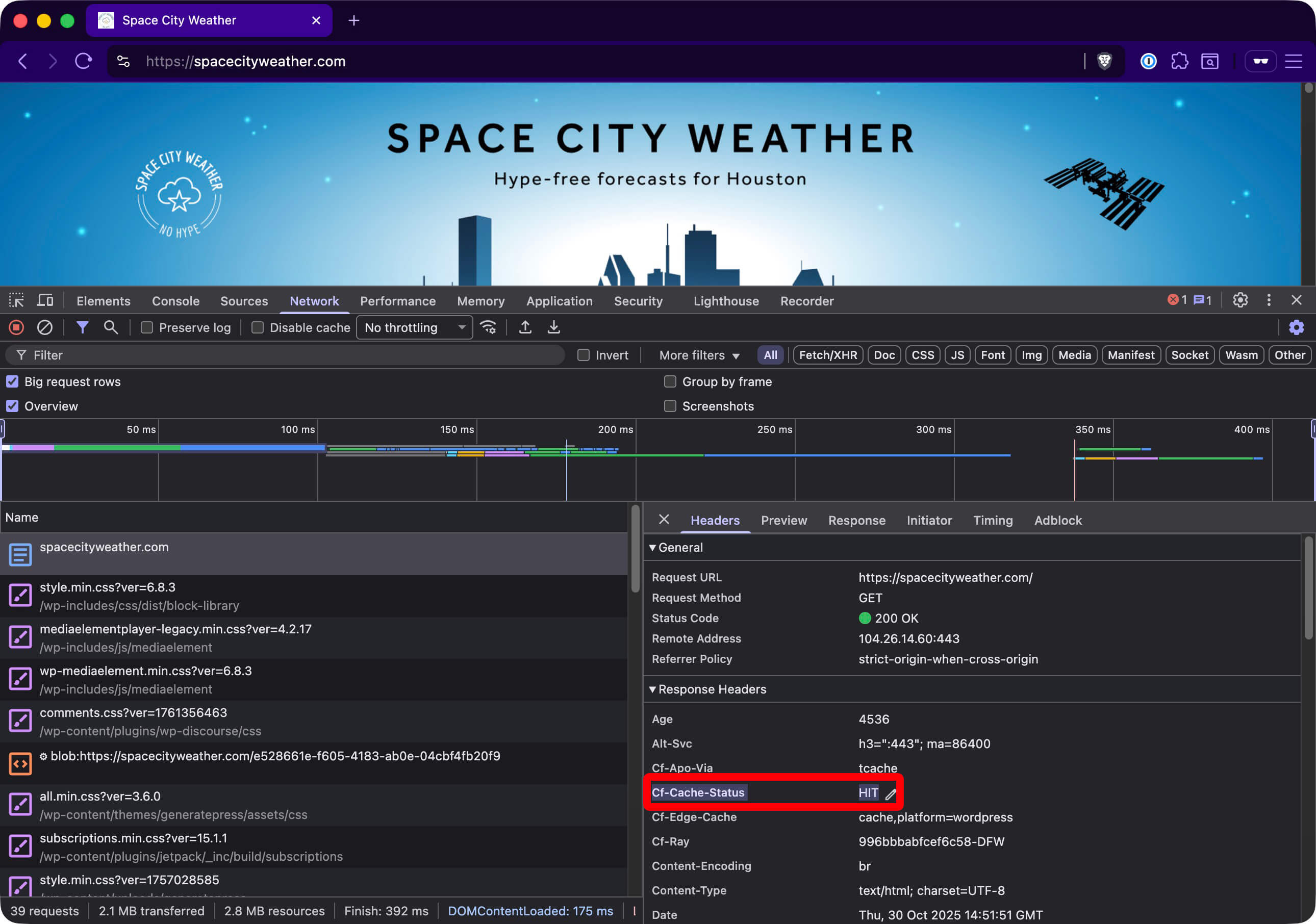 Click that request to open up an inspector window to the right. We want to look at the “response headers”—that is, the little bits of metadata the web server attaches to each request to tell your browser what it’s doing. Specifically, we’re looking for a header named CF-Cache-Status. You should see “HIT” there, indicating the page was served from Cloudflare’s cache. You also might occasionally “MISS” if Cloudflare has just invalidated its cache and had to reach back to the web server. Either of those is OK: