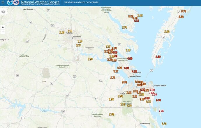 The coastal storm in the Mid-Atlantic is now inland and winding itself down. Rain totals were impressive, with 36-hour values up to nearly 8 inches around Virginia Beach.