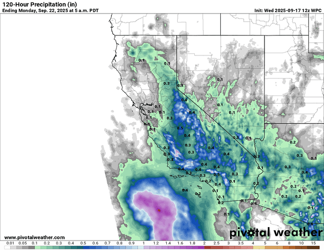 The remnant moisture from Tropical Storm Mario will move north today and tomorrow, bringing the risk of heavy rain to California. The overall track of the moisture seems to have shifted a little west, which means much of California will see scattered showers and thunderstorms, especially west of the deserts. The good news is that it appears most of these thunderstorms in this setup look wet, with lesser dry lightning risk than initially feared. This should keep fire risk relatively low.