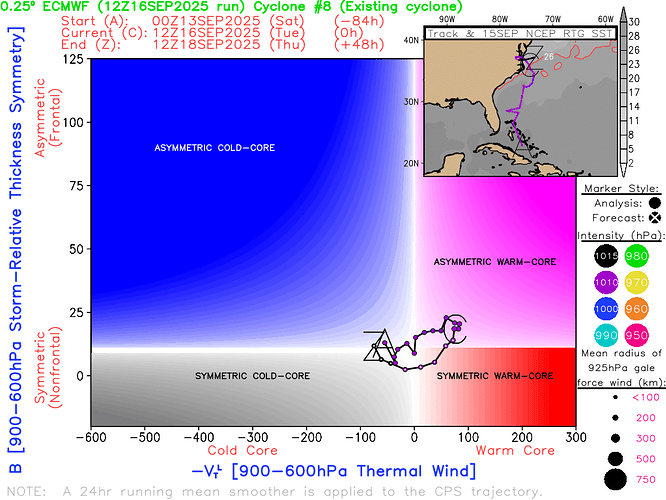 But then if you look at the “phase” part of the diagram, notice how it went from cold core (extratropical) to warm core (tropical). This is where the “sub” comes in with subtropical. It began as a frontal low pressure system, basically just a disturbance organizing on a cold front, something we see many times each year across the country. Since it was over warm water, the disturbance gradually took on *some* (not full) tropical characteristics as it came north, and now it will retreat back to non-tropical phase. This feels like the type of system that will get an extra look in the offseason, and it may turn out that this was our first September storm.