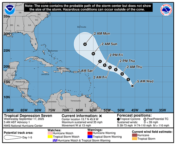 The only land we’re focused on right now for a potential threat is Bermuda. Models seem split right now on whether it tracks toward Bermuda or curves back into the Atlantic east of the island. We’re about 6 days out from that happening, either way. Interests in Bermuda, be it for travel or otherwise should monitor Tropical Depression 7 over the coming days.