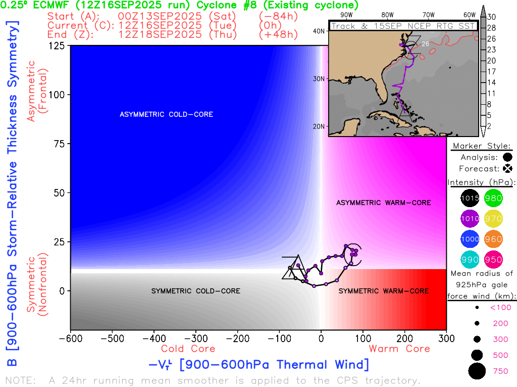 The question about this system will persist into the offseason. Was this a subtropical storm? Did it have characteristics of both a nor’easter-type storm (extratropical) and a tropical storm? The answer is very much “yes, it’s plausible.” If you look at what is known as a cyclone phase diagram, constructed by Dr. Robert Hart at Florida State University, you can see on the map inset how (based on yesterday’s European model guidance), the disturbance originated in the tropics (A) and lifted north to the Mid-Atlantic coast (C) where it will basically dissipate.