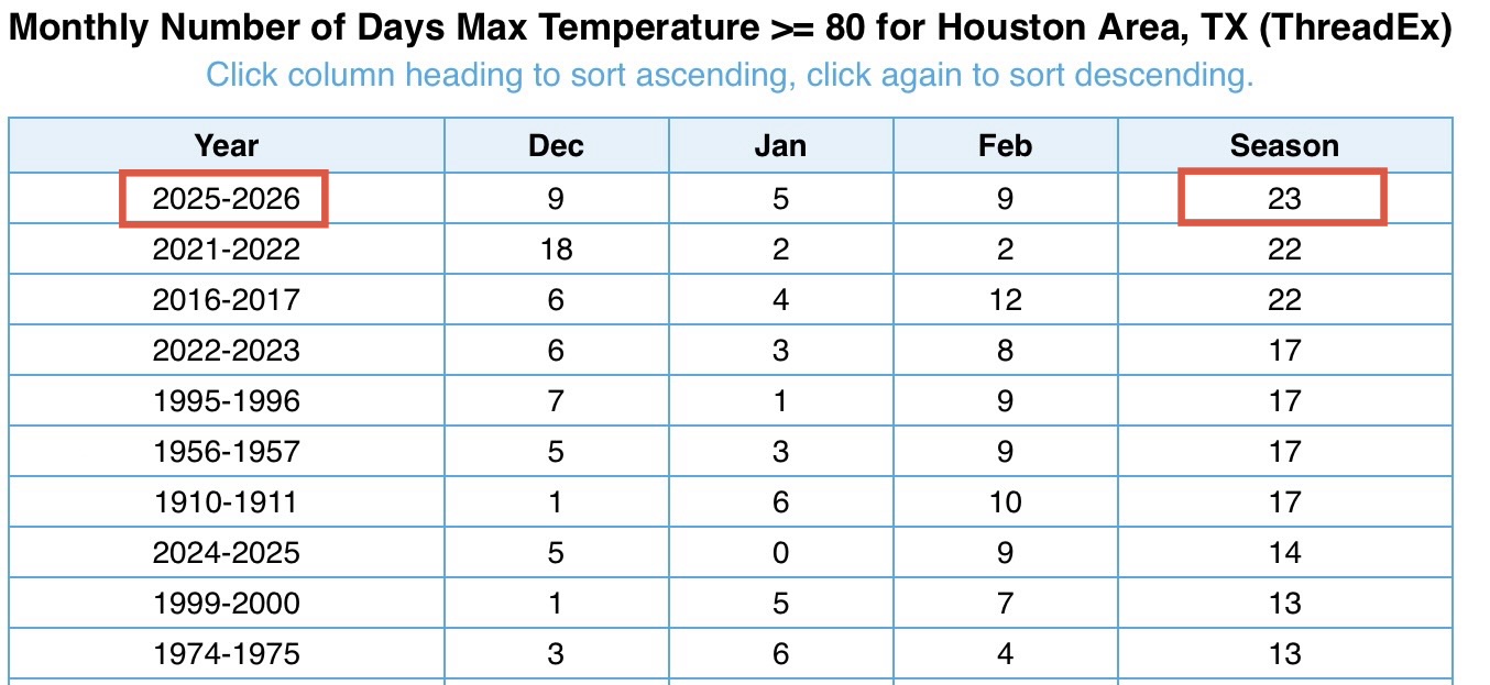2025-26 should finish at 25 80 degrees days, besting the 2021-22 and 2016-17 record of 22. Yes, this was a historically warm winter in Houston.